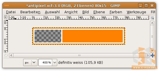 Nun zum eigentlichen Thema: Wie erstellt man selbst einen solchen »Antipixel«? Zunächst einmal einfach ein neues Dokument im Format von 80x15 Pixel mit transparentem Hintergrund erstellen. Anschließend die erste bereits vorhandene Ebene (in der später zu findenden Ebenenübersicht als »passepartout« betitelt) in der Farbe einfärben, in welcher später Rand und die Farbfläche unter dem Text erscheinen sollen. Ich habe dafür das Orange gewählt welches auch auf meiner Website mehrfach zu finden ist.