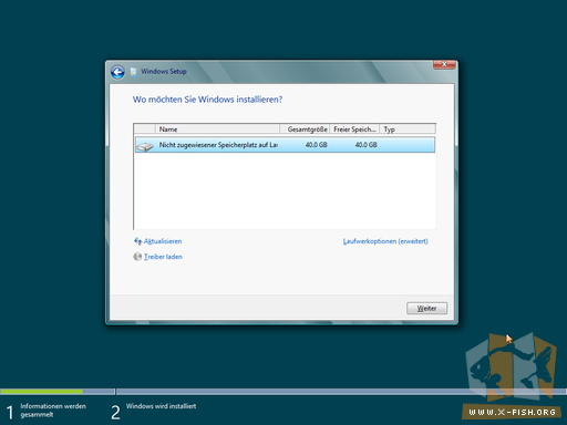 Nun kann endlich die eigentliche Installation beginnen. Die für die virtuelle Maschine eingerichtete Festplatte kann vollständig von Windows 8 CP genutzt werden. 40 Gigabyte sollten für einen Test genügen – zumindest gab es bei mir damit keine Probleme.