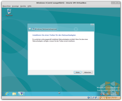 Per Mausklicks kam ich dann auch gleich dem ersten Problem auf die Spur: Die von VirtualBox standardmäßig ausgewählte virtuelle Netzwerkkarte wurde von Windows 8 CP nicht erkannt. Daher hatte ich auch keine Anbindung zur Außenwelt.